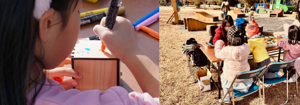 「あいちの山里関係人口拡大事業」で実施している「あいちの山里 社会実装大作戦!」において、名古屋学院大学の学生5人が、2025年12月06日(土)に岡崎・額田地区で開催された毎年恒例のイベント「オクオカわんぱくまつり2025」で、額田の木を使った桝のワークショップを出店しました。