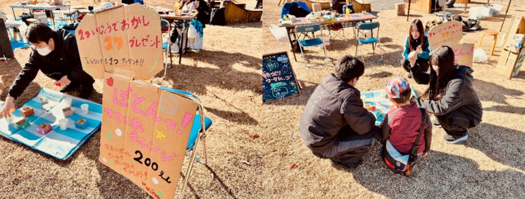 また、「ぽとんっ!マスいれチャレンジ」と銘打ったゲームも考案し、2つ以上の桝にボールを入れるとお菓子の景品をもらえます。